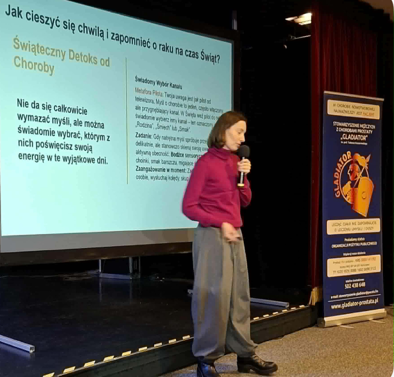 Psychoonkolog – Pani Aleksandra Dyzner pokazała się jako osoba nie tylko empatyczna i wrażliwa na problemy chorobowe innych, ale przytoczyła fakty z własnego życia, które pozwoliły jej samej uporać się z chorobą. Wspomagała ją ofiarnie rodzina, a zebrane doświadczenia zaprocentowały w pracy zawodowej. Najważniejsze to, aby nie pozwolić zapanować chorobie nie tylko nad własnym organizmem, ale i psychiką.